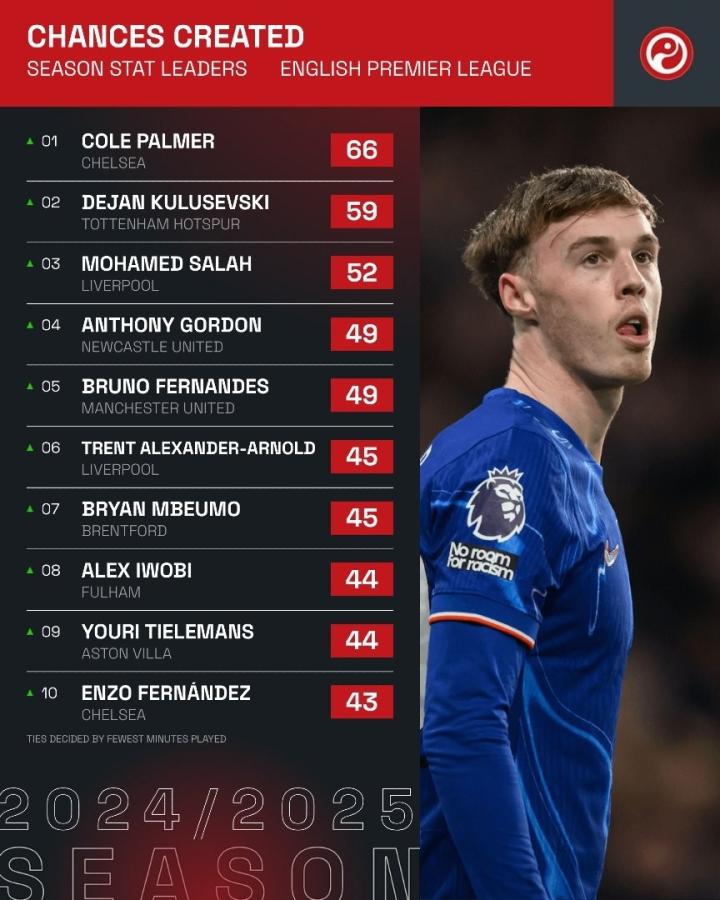 随着英超联赛24轮的比赛结束,数据统计结果显示,本赛季的英超球员们在比赛中展现出了惊人的创造力。而其中,切尔西的帕尔默名列榜首,他共计创造了66次机会,成为本赛季创造机会最多的球员。紧随其后的是热刺的库卢塞夫斯基,他共计创造了59次机会,表现出色。而利物浦的萨拉赫则以52次机会排名第三,展现出了其进攻端的威胁性。
